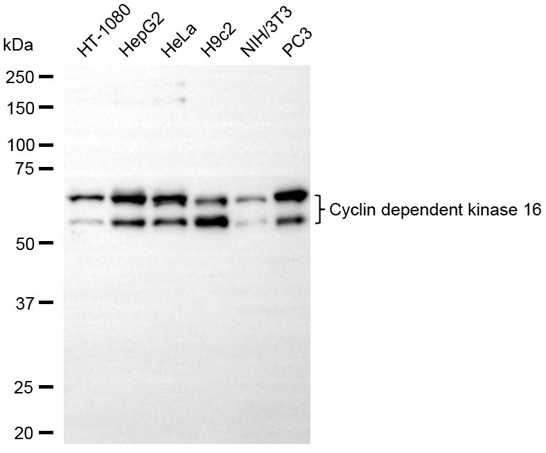 Western blotting analysis using cyclin dependent kinase 16 antibody. Total cell lysates (30 μg) from various cell lines were loaded and separated by SDS-PAGE. The blot was incubated with cyclin dependent kinase 16 antibody and HRP-conjugated goat anti-rabbit secondary antibody respectively.