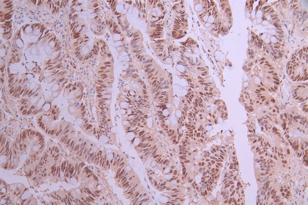 IHC image of CSB-RA699720A0HU diluted at 1:100 and staining in paraffin-embedded human colorectal cancer performed on a Leica BondTM system. After dewaxing and hydration, antigen retrieval was mediated by high pressure in a citrate buffer (pH 6.0). Section was blocked with 10% normal goat serum 30min at RT. Then primary antibody (1% BSA) was incubated at 4°C overnight. The primary is detected by a Goat anti-rabbit polymer IgG labeled by HRP and visualized using 0.05% DAB.
