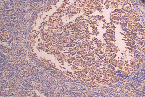 IHC image of CSB-RA699720A0HU diluted at 1:100 and staining in paraffin-embedded human tonsil tissue performed on a Leica BondTM system. After dewaxing and hydration, antigen retrieval was mediated by high pressure in a citrate buffer (pH 6.0). Section was blocked with 10% normal goat serum 30min at RT. Then primary antibody (1% BSA) was incubated at 4°C overnight. The primary is detected by a Goat anti-rabbit polymer IgG labeled by HRP and visualized using 0.05% DAB.