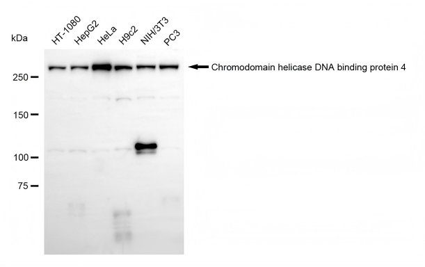 Western blotting analysis using chromodomain helicase DNA binding protein 4 antibody. Total cell lysates (30 μg) from various cell lines were loaded and separated by SDS-PAGE. The blot was incubated with chromodomain helicase DNA binding protein 4 antibody and HRP-conjugated goat anti-rabbit secondary antibody respectively.