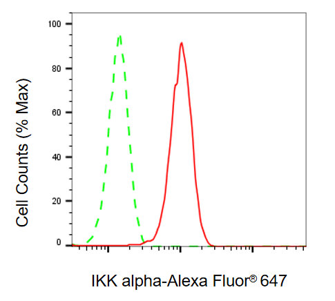 Flow cytometric analysis of IKK alpha expression in HepG2 cells using IKK alpha antibody. Green, isotype control; red, IKK alpha.