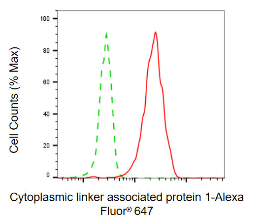 Flow cytometric analysis of cytoplasmic linker associated protein 1 expression in HepG2 cells using cytoplasmic linker associated protein 1 antibody. Green, isotype control; red, cytoplasmic linker associated protein 1.