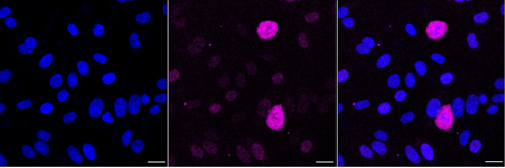 Immunocytochemical staining of HepG2 cells with Cytoplasmic linker associated protein 1 antibody. Nuclei were stained blue with DAPI; Cytoplasmic linker associated protein 1 was stained magenta with Alexa Fluor? 647. Images were taken using Leica stellaris 5. Protein abundance based on laser Intensity and smart gain: Medium. Scale bar, 20 μm.