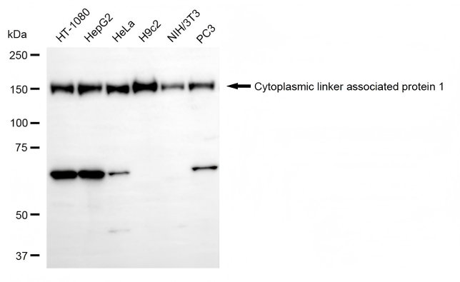 Western blotting analysis using cytoplasmic linker associated protein 1 antibody. Total cell lysates (30 μg) from various cell lines were loaded and separated by SDS-PAGE. The blot was incubated with cytoplasmic linker associated protein 1 antibody and HRP-conjugated goat anti-rabbit secondary antibody respectively.