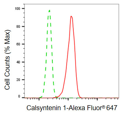 Flow cytometric analysis of calsyntenin 1 expression in HT-1080 cells using calsyntenin 1 antibody. Green, isotype control; red, calsyntenin 1.