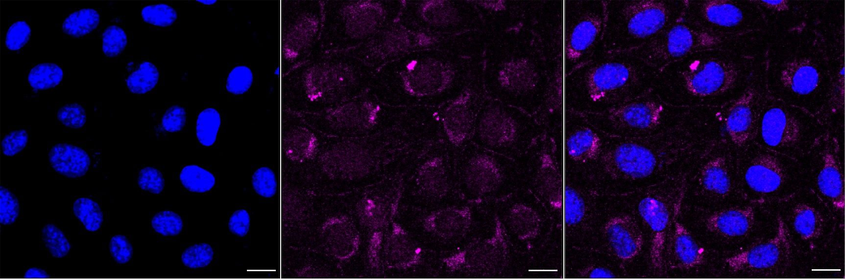 Immunocytochemical staining of HT-1080 cells with Calsyntenin 1 antibody. Nuclei were stained blue with DAPI; Calsyntenin 1 was stained magenta with Alexa Fluor? 647. Images were taken using Leica stellaris 5. Protein abundance based on laser Intensity and smart gain: Medium. Scale bar, 20 μm.