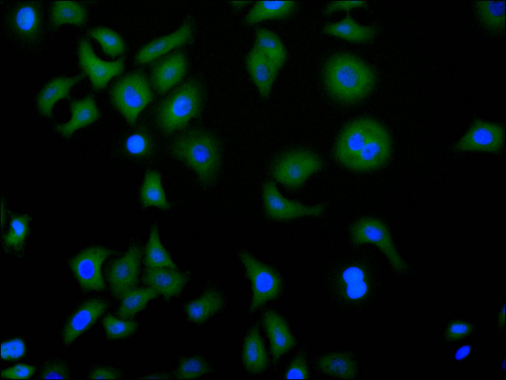 Immunofluorescence staining of A549 cell with CSB-RA005595MA2HU at 1:30 ,counter-stained with DAPI. The cells were fixed in 4% formaldehyde, permeabilized using 0.2% Triton X-100 and blocked in 10% normal Goat Serum. The cells were then incubated with the antibody overnight at 4°C. The secondary antibody was Alexa Fluor 488-congugated AffiniPure Goat Anti-Human IgG(H+L).