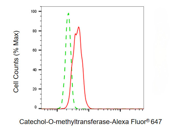 Flow cytometric analysis of Catechol-O-methyltransferase expression in HT-1080 cells using Catechol-O-methyltransferase antibody. Green, isotype control; red, Catechol-O-methyltransferase.