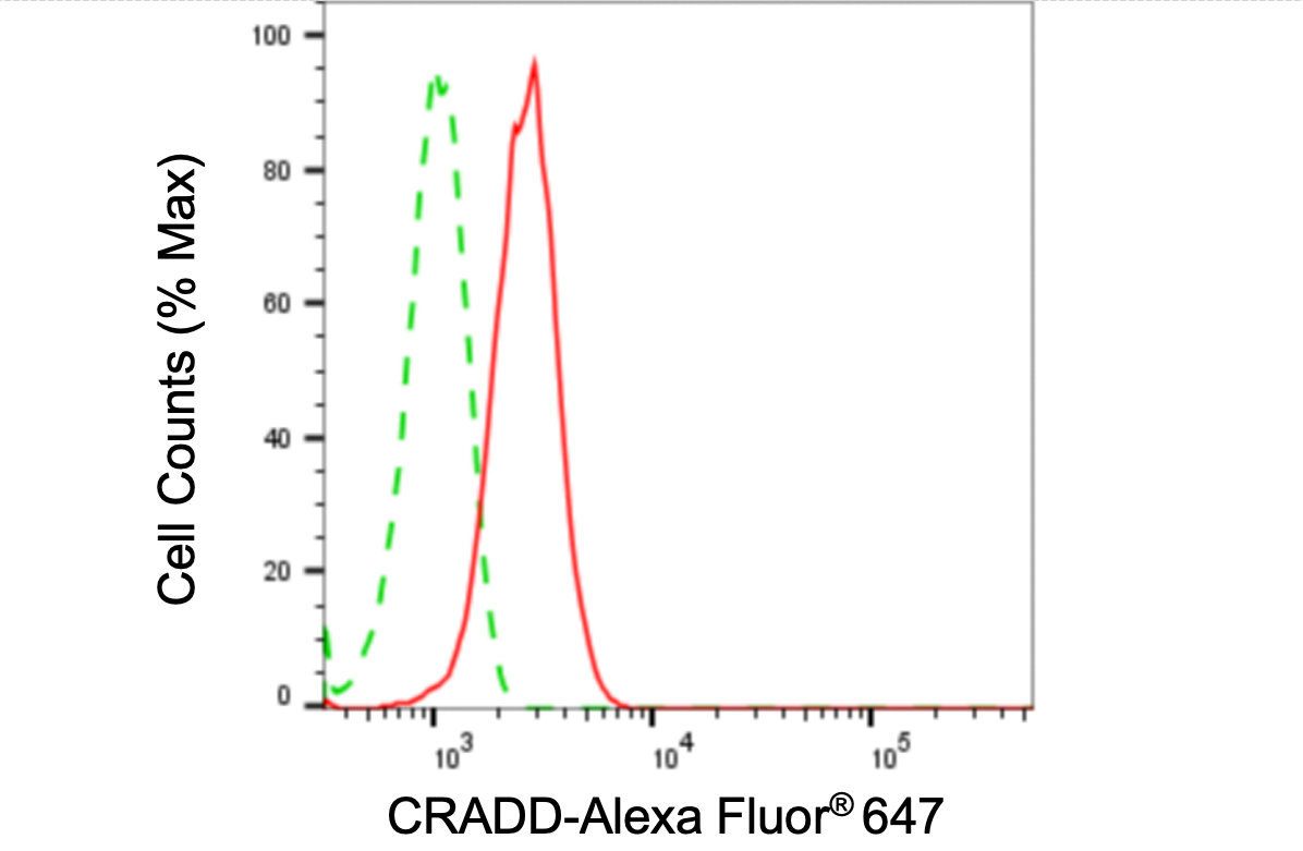 Flow cytometric analysis of CRADD expression in HepG2 cells using CRADD antibody. Green, isotype control; red, CRADD.