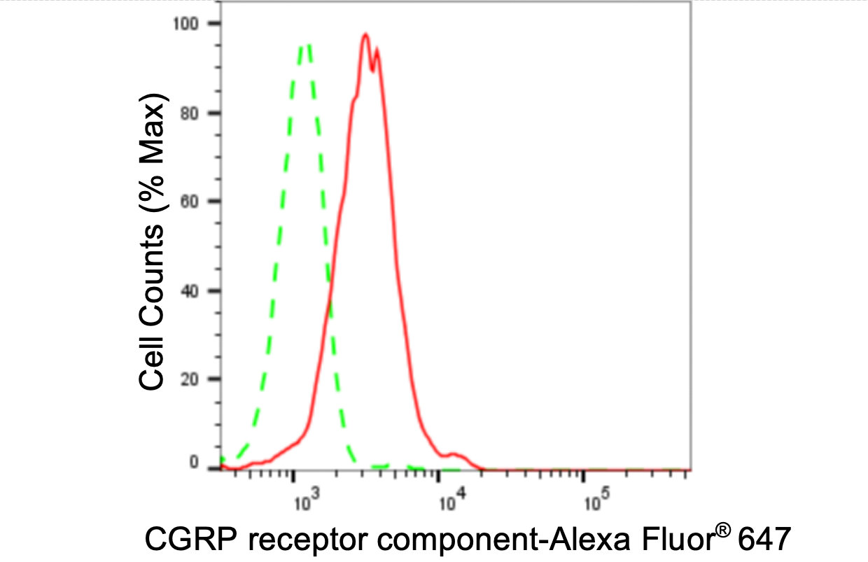 Flow cytometric analysis of CGRP receptor component expression in HepG2 cells using CGRP receptor component antibody. Green, isotype control; red, CGRP receptor component.