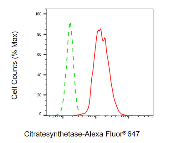 Flow cytometric analysis of Citrate synthetase expression in HepG2 cells using Citrate synthetase antibody. Green, isotype control; red, Citrate synthetase.