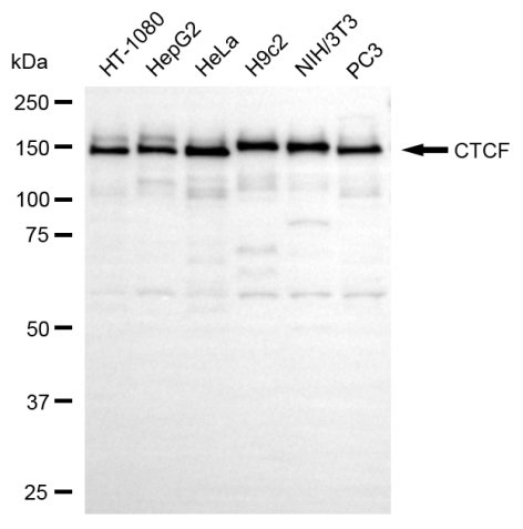Western blotting analysis using CTCF antibody. Total cell lysates (30 μg) from various cell lines were loaded and separated by SDS-PAGE. The blot was incubated with CTCF antibody and HRP-conjugated goat anti-rabbit secondary antibody respectively.