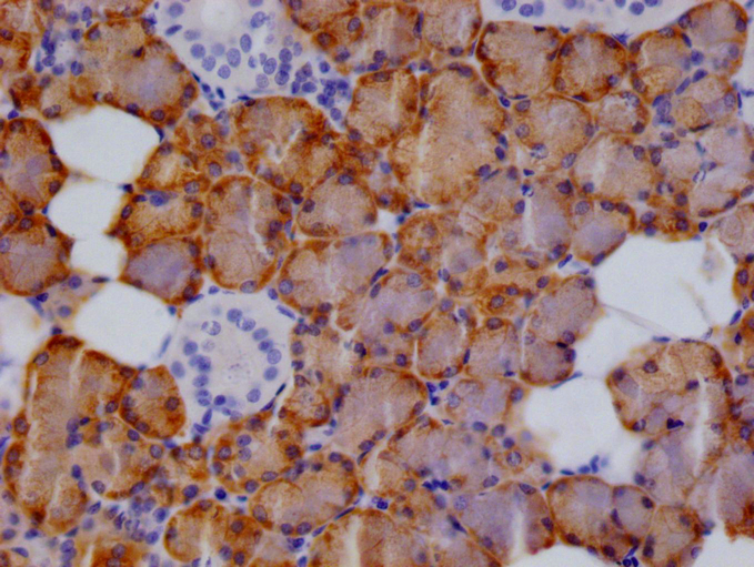 IHC image of CSB-RA548305A0HU diluted at 1:100 and staining in paraffin-embedded human salivary gland tissue performed on a Leica BondTM system. After dewaxing and hydration, antigen retrieval was mediated by high pressure in a citrate buffer (pH 6.0). Section was blocked with 10% normal goat serum 30min at RT. Then primary antibody (1% BSA) was incubated at 4°C overnight. The primary is detected by a Goat anti-rabbit polymer IgG labeled by HRP and visualized using 0.05% DAB.