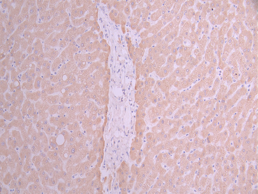 IHC image of CSB-RA234050A0HU diluted at 1:100 and staining in paraffin-embedded human liver tissue performed on a Leica BondTM system. After dewaxing and hydration, antigen retrieval was mediated by high pressure in a citrate buffer (pH 6.0). Section was blocked with 10% normal goat serum 30min at RT. Then primary antibody (1% BSA) was incubated at 4°C overnight. The primary is detected by a Goat anti-rabbit polymer IgG labeled by HRP and visualized using 0.05% DAB.