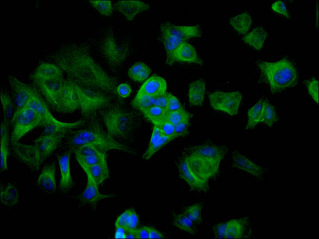 Immunofluorescence staining of MCF-7 cell with CSB-RA033218A0HU at 1:50, counter-stained with DAPI. The cells were fixed in 4% formaldehyde and blocked in 10% normal Goat Serum. The cells were then incubated with the antibody overnight at 4°C. The secondary antibody was Alexa Fluor 488-congugated AffiniPure Goat Anti-Rabbit IgG(H+L).