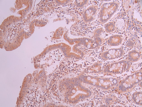 IHC image of CSB-RA033218A0HU diluted at 1:100 and staining in paraffin-embedded human small intestine tissue performed on a Leica BondTM system. After dewaxing and hydration, antigen retrieval was mediated by high pressure in a citrate buffer (pH 6.0). Section was blocked with 10% normal goat serum 30min at RT. Then primary antibody (1% BSA) was incubated at 4°C overnight. The primary is detected by a Goat anti-rabbit polymer IgG labeled by HRP and visualized using 0.05% DAB.