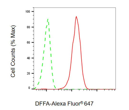 Flow cytometric analysis of DFFA expression in HeLa cells using DFFA antibody. Green, isotype control; red, DFFA.