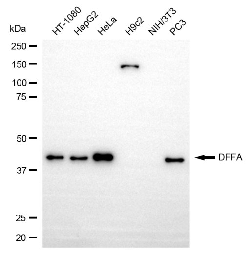 Western blotting analysis using DFFA antibody. Total cell lysates (30 μg) from various cell lines were loaded and separated by SDS-PAGE. The blot was incubated with DFFA antibody and HRP-conjugated goat anti-rabbit secondary antibody respectively.