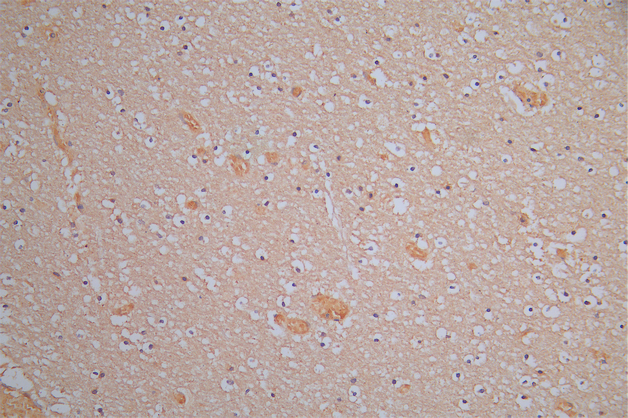 IHC image of CSB-RA614975MA1HU diluted at 1:150 and staining in paraffin-embedded human brain tissue performed on a Leica BondTM system. After dewaxing and hydration, antigen retrieval was mediated by high pressure in a citrate buffer (pH 6.0). Section was blocked with 10% normal goat serum 30min at RT. Then primary antibody (1% BSA) was incubated at 4°C overnight. The primary is detected by a Goat anti-Rabbit IgG labeled by HRP and visualized using 0.05% DAB.