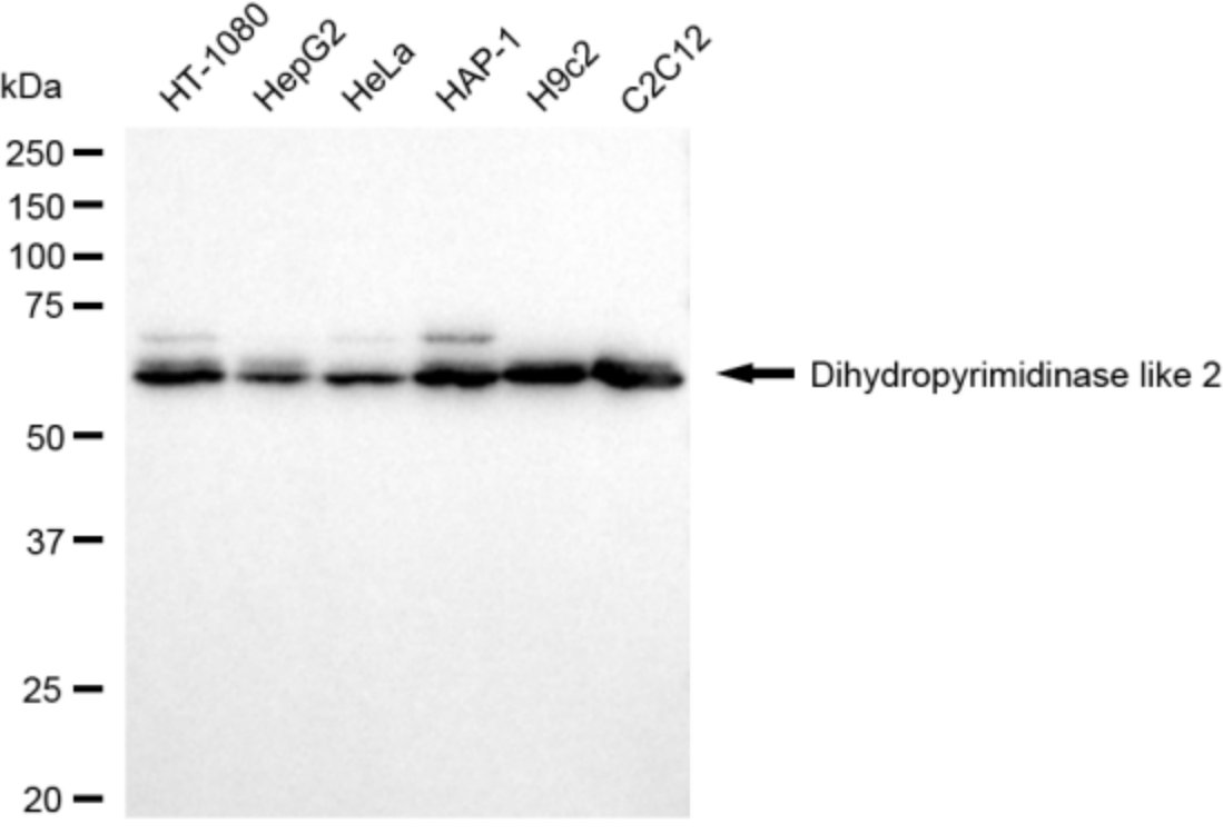 Western blotting analysis using Dihydropyrimidinase like 2 antibody. Total cell lysates (30 μg) from various cell lines were loaded and separated by SDS-PAGE. The blot was incubated with Dihydropyrimidinase like 2 antibody and HRP-conjugated goat anti-rabbit secondary antibody respectively.