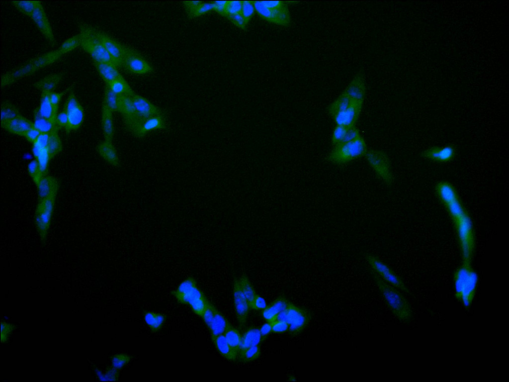 Immunofluorescence staining of SH-SY5Y cell with CSB-RA821036MA1HU at 1:30 ,counter-stained with DAPI. The cells were fixed in 4% formaldehyde, permeabilized using 0.2% Triton X-100 and blocked in 10% normal Goat Serum. The cells were then incubated with the antibody overnight at 4°C. The secondary antibody was Alexa Fluor 488-congugated AffiniPure Goat Anti-Human IgG(H+L).