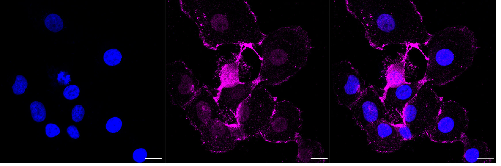 Immunocytochemical staining of HT-1080 cells with Phospho-Phospho-PKR (T451)? antibody. Nuclei were stained blue with DAPI;Phospho-Phospho-PKR (T451)? was stained magenta with Alexa Fluor? 647. Images were taken using Leica stellaris 5. Protein abundance based on laser Intensity and smart gain: Medium. Scale bar, 20 μm.