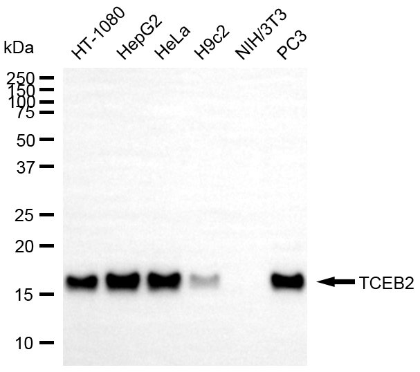 Western blotting analysis using TCEB2 antibody. Total cell lysates (30 μg) from various cell lines were loaded and separated by SDS-PAGE. The blot was incubated with TCEB2 antibody and HRP-conjugated goat anti-rabbit secondary antibody respectively.