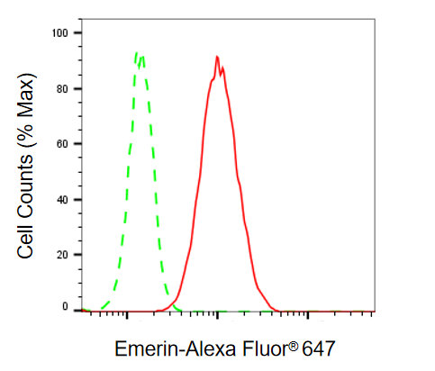 Flow cytometric analysis of emerin expression in H9c2 cells using emerin antibody. Green, isotype control; red, emerin.
