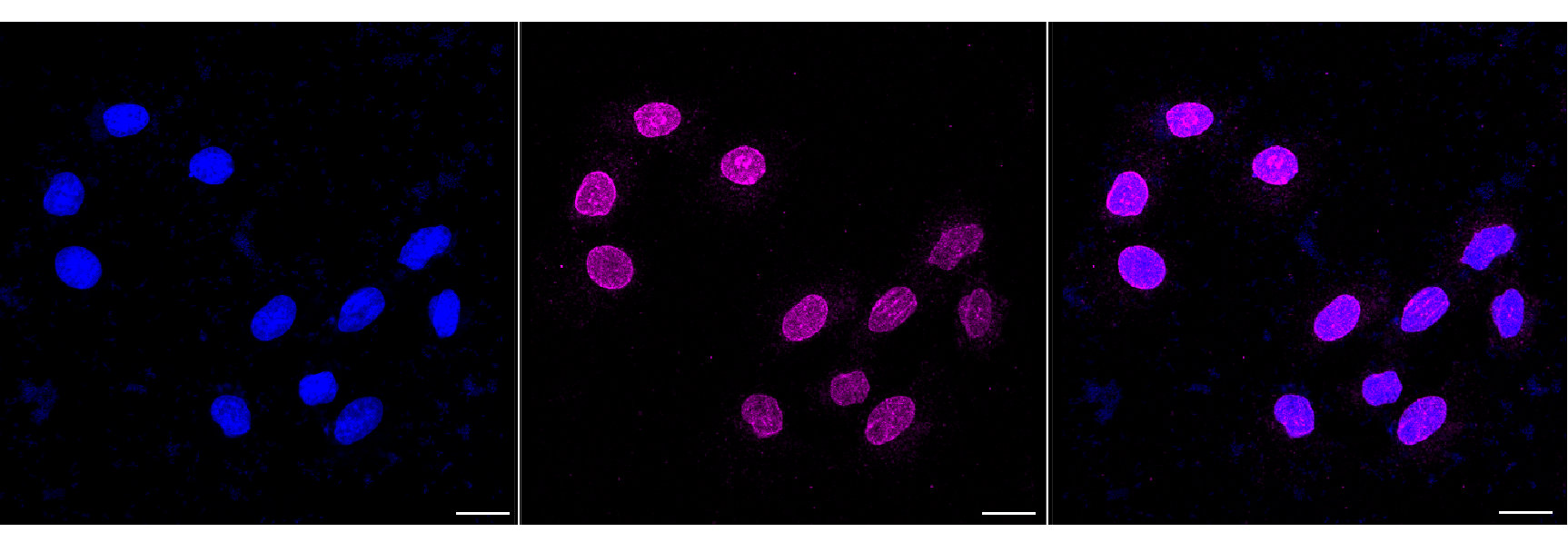 Immunocytochemical staining of H9c2 cells with emerin antibody. Nuclei were stained blue with DAPI; Emerin was stained magenta with Alexa Fluor? 647. Images were taken using Leica stellaris 5. Protein abundance based on laser Intensity and smart gain: Medium. Scale bar, 20 μm.