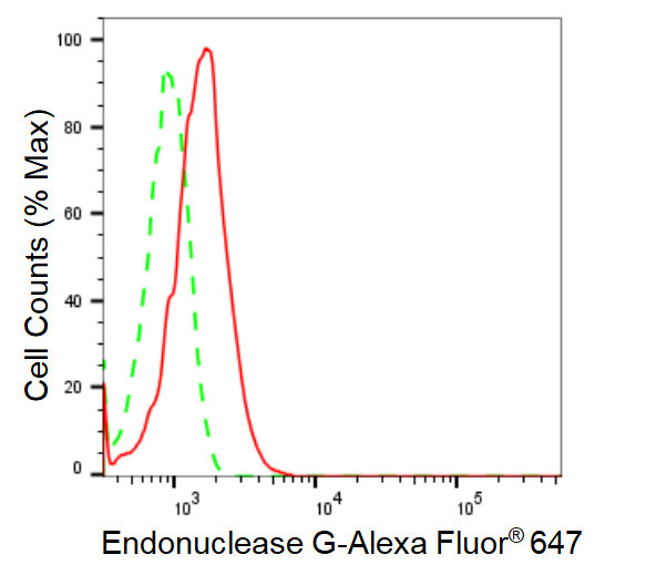 Flow cytometric analysis of Endonuclease G expression in HepG2 cells using Endonuclease G antibody. Green, isotype control; red, Endonuclease G.