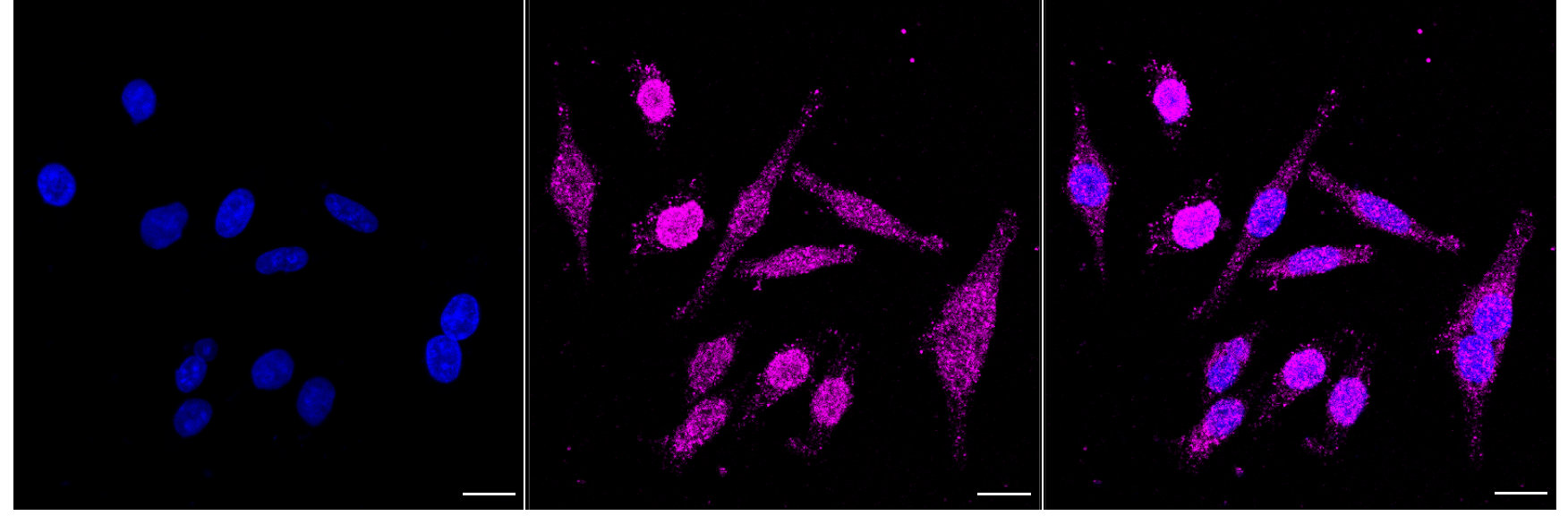 Immunocytochemical staining of HepG2 cells with Endonuclease G antibody. Nuclei were stained blue with DAPI; Endonuclease G was stained magenta with Alexa Fluor? 647. Images were taken using Leica stellaris 5. Protein abundance based on laser Intensity and smart gain: Medium. Scale bar, 20 μm.