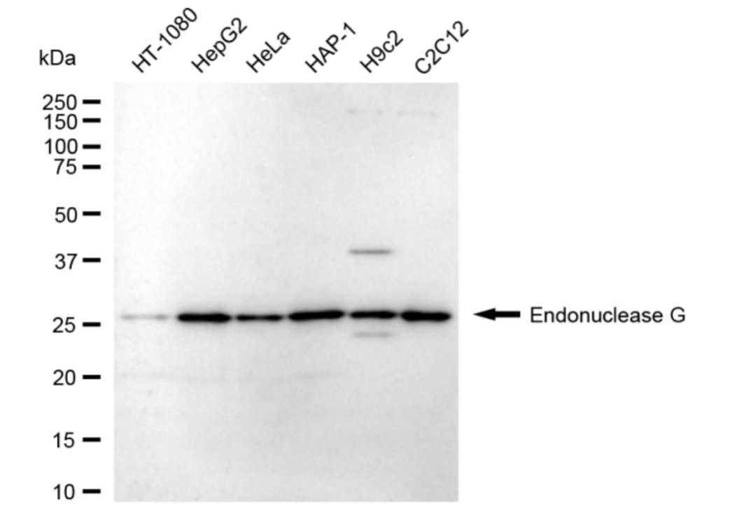 Western blotting analysis using Endonuclease G antibody. Total cell lysates (30 μg) from various cell lines were loaded and separated by SDS-PAGE. The blot was incubated with Endonuclease G antibody and HRP-conjugated goat anti-rabbit secondary antibody respectively.
