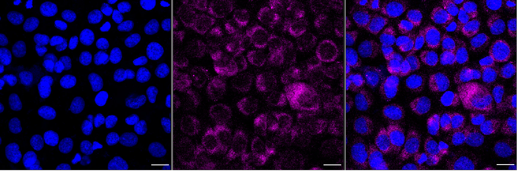 Immunocytochemical staining of HT-1080 cells with EOGT antibody. Nuclei were stained blue with DAPI; EOGT was stained magenta with Alexa Fluor? 647. Images were taken using Leica stellaris 5. Protein abundance based on laser Intensity and smart gain: Medium. Scale bar, 20 μm.