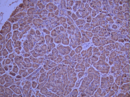 IHC image of CSB-RA272525A0HU diluted at 1:100 and staining in paraffin-embedded human pancreatic tissue performed on a Leica BondTM system. After dewaxing and hydration, antigen retrieval was mediated by high pressure in a citrate buffer (pH 6.0). Section was blocked with 10% normal goat serum 30min at RT. Then primary antibody (1% BSA) was incubated at 4°C overnight. The primary is detected by a Goat anti-rabbit polymer IgG labeled by HRP and visualized using 0.05% DAB.