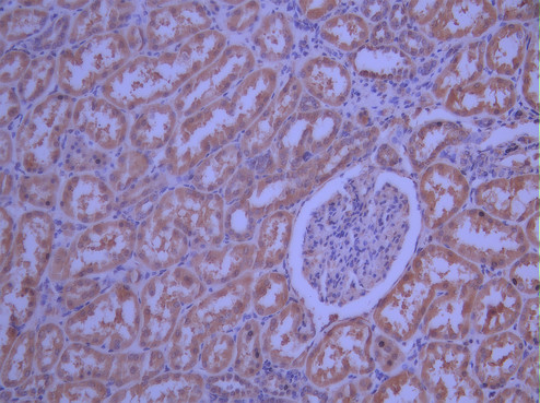 IHC image of CSB-RA272525A0HU diluted at 1:100 and staining in paraffin-embedded human kidney tissue performed on a Leica BondTM system. After dewaxing and hydration, antigen retrieval was mediated by high pressure in a citrate buffer (pH 6.0). Section was blocked with 10% normal goat serum 30min at RT. Then primary antibody (1% BSA) was incubated at 4°C overnight. The primary is detected by a Goat anti-rabbit polymer IgG labeled by HRP and visualized using 0.05% DAB.