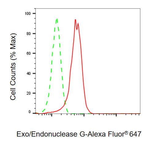 Flow cytometric analysis of Exo/Endonuclease G expression in HepG2 cells using Exo/Endonuclease G antibody. Green, isotype control; red, Exo/Endonuclease G.