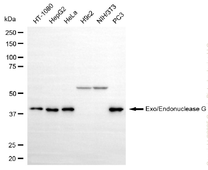 Western blotting analysis using exo/endonuclease G antibody. Total cell lysates (30 μg) from various cell lines were loaded and separated by SDS-PAGE. The blot was incubated with exo/endonuclease G antibody and HRP-conjugated goat anti-rabbit secondary antibody respectively.