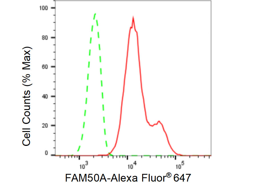 Flow cytometric analysis of FAM50A expression in HepG2 cells using FAM50A antibody. Green, isotype control; red, FAM50A.
