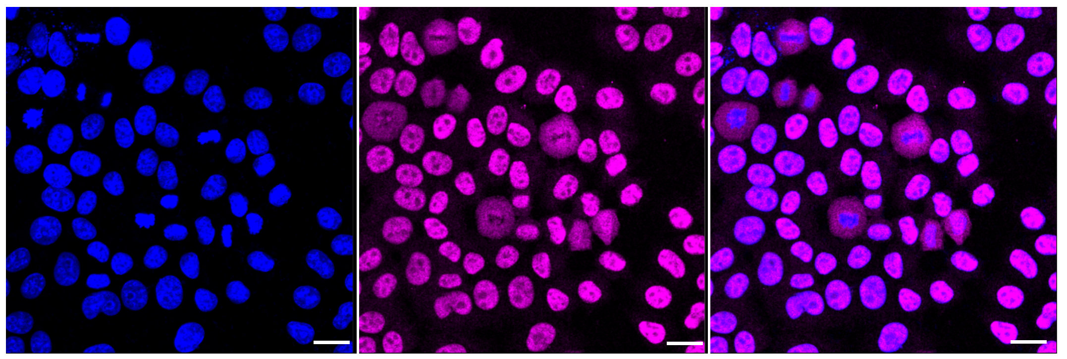 Immunocytochemical staining of HepG2 cells with FAM50A antibody. Nuclei were stained blue with DAPI; FAM50A was stained magenta with Alexa Fluor? 647. Images were taken using Leica stellaris 5. Protein abundance based on laser Intensity and smart gain: High. Scale bar, 20 μm.