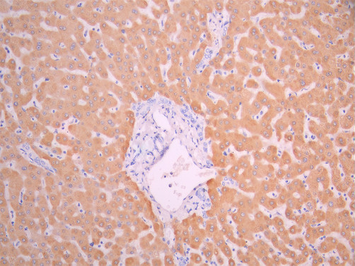 IHC image of CSB-RA144042A0HU diluted at 1:100 and staining in paraffin-embedded human liver tissue performed on a Leica BondTM system. After dewaxing and hydration, antigen retrieval was mediated by high pressure in a citrate buffer (pH 6.0). Section was blocked with 10% normal goat serum 30min at RT. Then primary antibody (1% BSA) was incubated at 4°C overnight. The primary is detected by a Goat anti-rabbit polymer IgG labeled by HRP and visualized using 0.05% DAB.