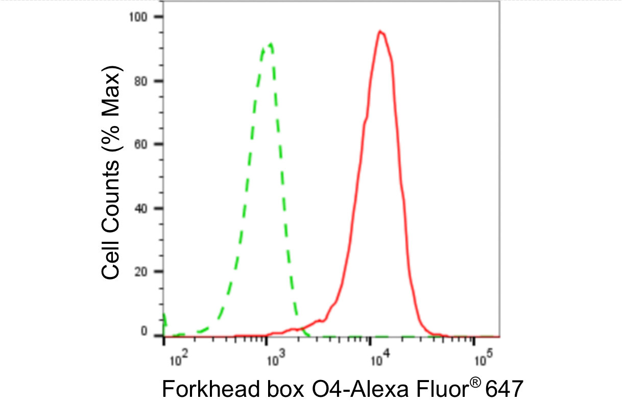 Flow cytometric analysis of Forkhead box O4 expression in HeLa cells using Forkhead box O4 antibody. Green, isotype control; red, Forkhead box O4.