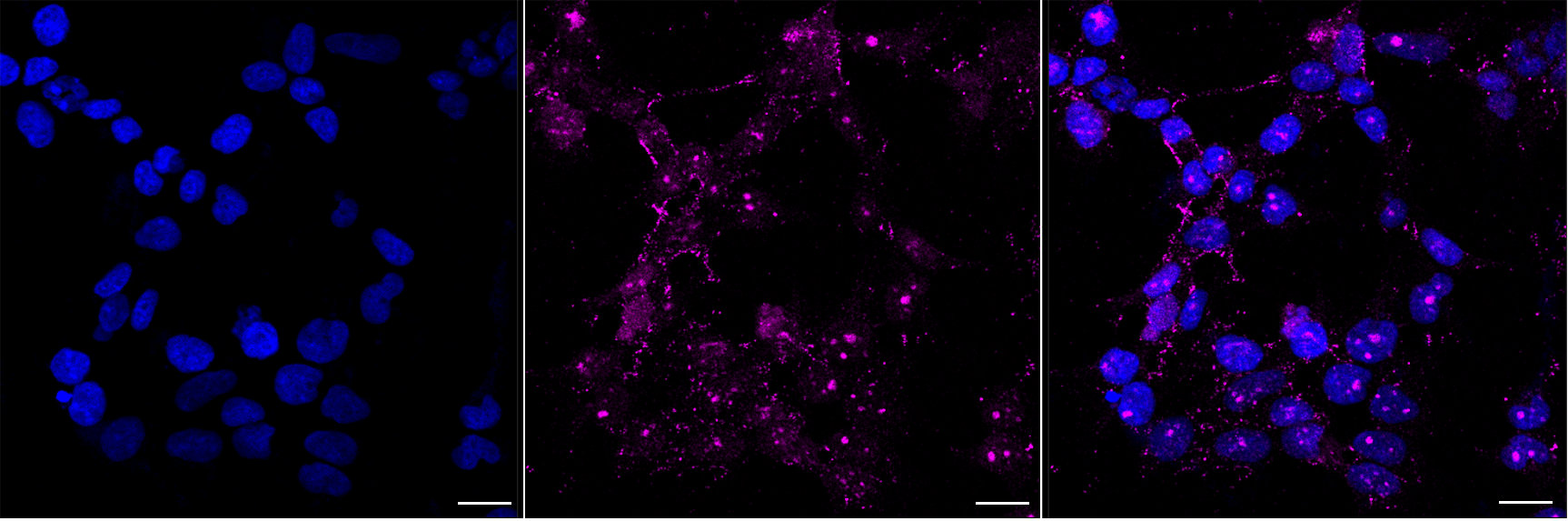 Immunocytochemical staining of Hela cells with Forkhead box O4 protein antibody. Nuclei were stained blue with DAPI; Forkhead box O4 was stained magenta with Alexa Fluor? 647. Images were taken using Leica stellaris 5. Protein abundance based on laser Intensity and smart gain: Medium. Scale bar, 20 μm.