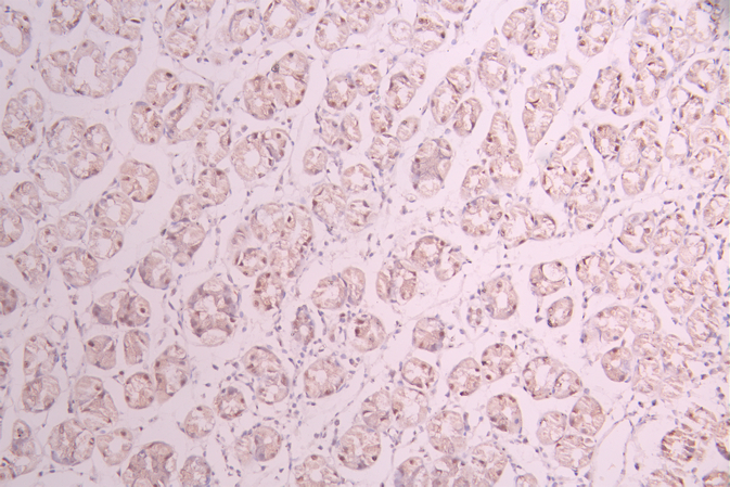 IHC image of CSB-RA797360A0HU diluted at 1:100 and staining in paraffin-embedded human stomach tissue performed on a Leica BondTM system. After dewaxing and hydration, antigen retrieval was mediated by high pressure in a citrate buffer (pH 6.0). Section was blocked with 10% normal goat serum 30min at RT. Then primary antibody (1% BSA) was incubated at 4°C overnight. The primary is detected by a Goat anti-rabbit polymer IgG labeled by HRP and visualized using 0.05% DAB.