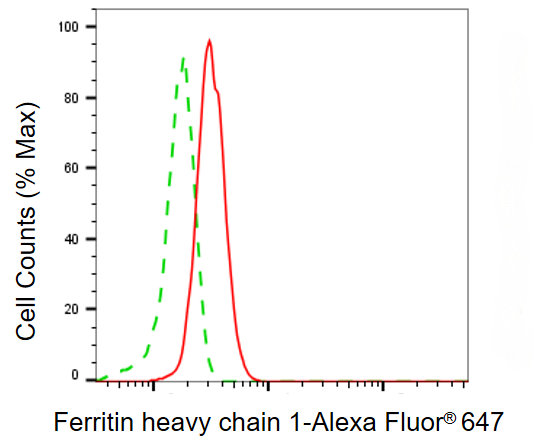 Flow cytometric analysis of Ferritin heavy chain 1 expression in HepG2 cells using Ferritin heavy chain 1 antibody. Green, isotype control; red, Ferritin heavy chain 1.