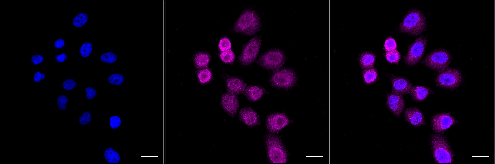 Immunocytochemical staining of HepG2 cells with Ferritin heavy chain 1 antibody. Nuclei were stained blue with DAPI; Ferritin heavy chain 1 was stained magenta with Alexa Fluor? 647. Images were taken using Leica stellaris 5. Protein abundance based on laser Intensity and smart gain: Medium. Scale bar, 20 μm.