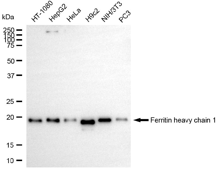 Western blotting analysis using ferritin heavy chain 1 antibody. Total cell lysates (30 μg) from various cell lines were loaded and separated by SDS-PAGE. The blot was incubated with ferritin heavy chain 1 antibody and HRP-conjugated goat anti-rabbit secondary antibody respectively.