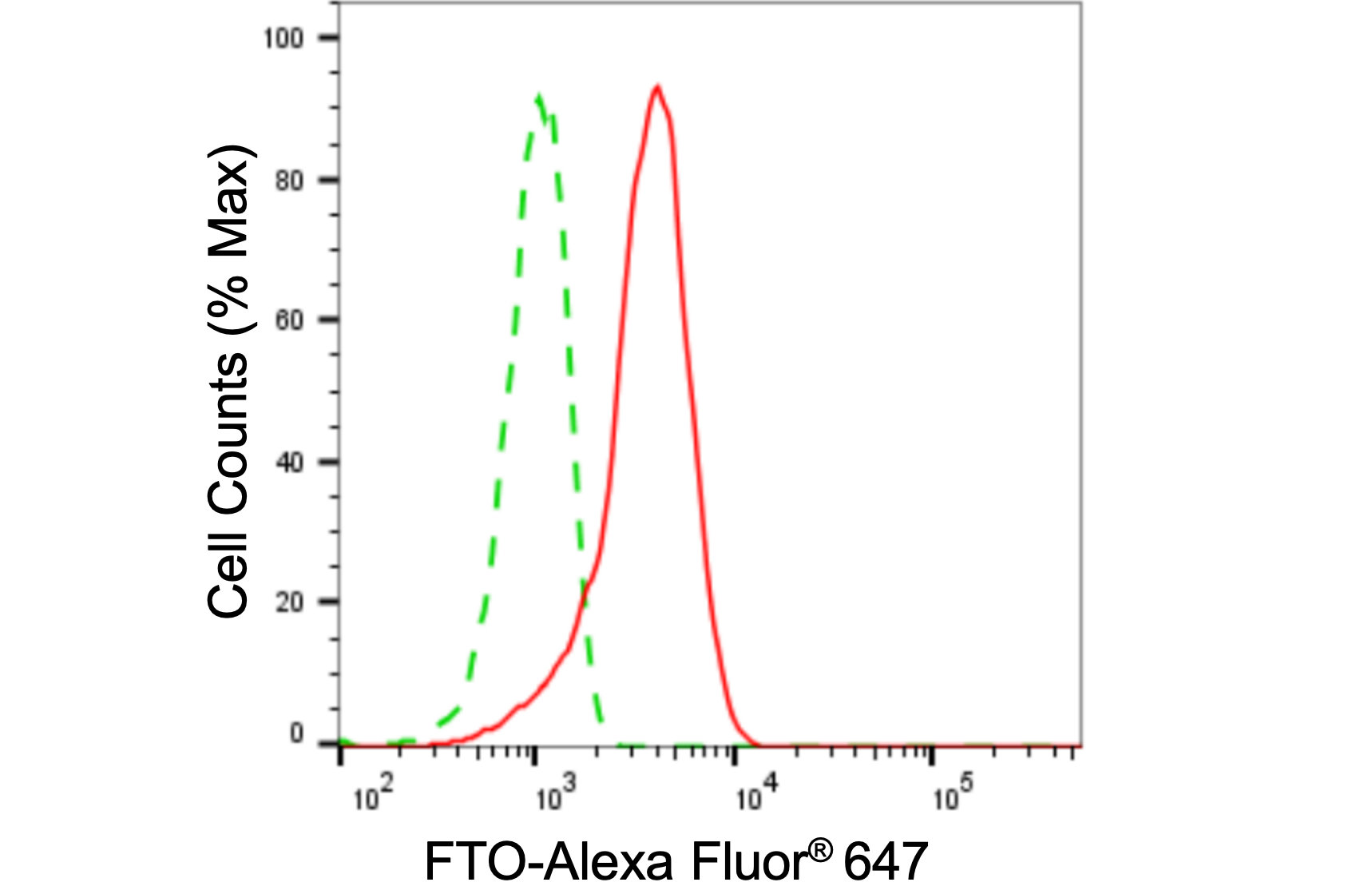 Flow cytometric analysis of FTO expression in HepG2 cells using FTO antibody. Green, isotype control; red, FTO.