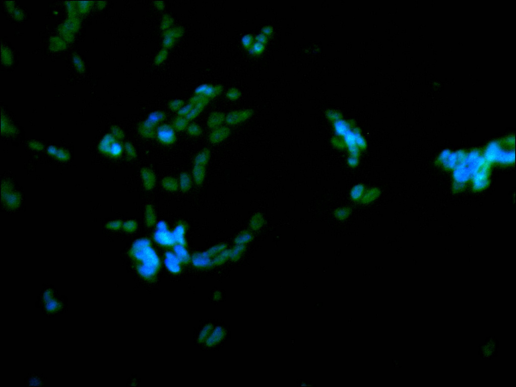 Immunofluorescence staining of SH-SY5Y cell with CSB-RA796544A0HU at 1:50, counter-stained with DAPI. The cells were fixed in 4% formaldehyde, permeabilized using 0.2% Triton X-100 and blocked in 10% normal Goat Serum. The cells were then incubated with the antibody overnight at 4°C. The secondary antibody was Alexa Fluor 488-congugated AffiniPure Goat Anti-Rabbit IgG(H+L).