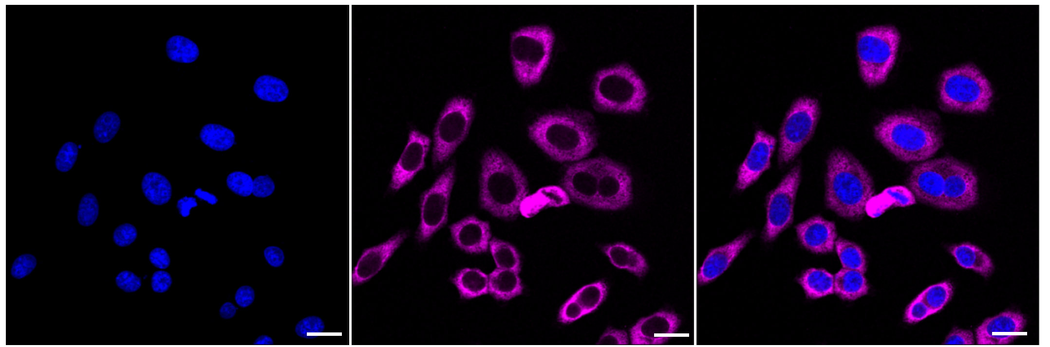 Immunocytochemical staining of HepG2 cells with G3BP antibody. Nuclei were stained blue with DAPI; G3BP was stained magenta with Alexa Fluor? 647. Images were taken using Leica stellaris 5. Protein abundance based on laser Intensity and smart gain: High. Scale bar: 20 μm.