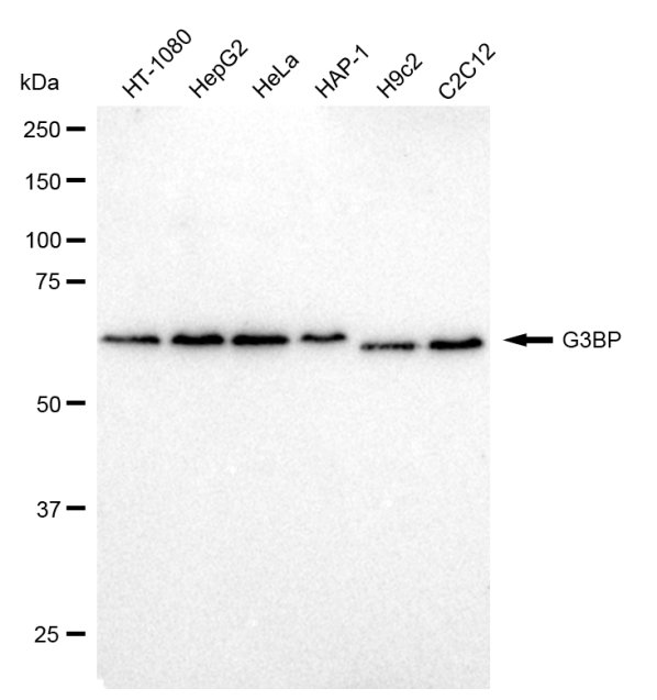 Western blotting analysis using G3BP antibody. Total cell lysates (30 μg) from various cell lines were loaded and separated by SDS-PAGE. The blot was incubated with G3BP antibody and HRP-conjugated goat anti-rabbit secondary antibody respectively.